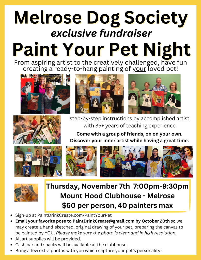 - Email your favorite, clear pet photo to PaintDrinkCreate@gmail.com by October 20th to allow for a hand-sketched canvas of your pet.