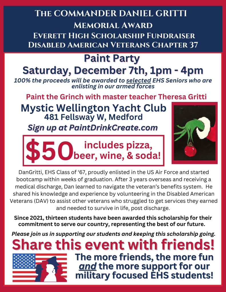 100% of the proceeds will be for The COMMANDER DANIEL GRITTI MEMORIAL AWARD Disabled American Veterans Chapter 37 Everett High Scholarship which supports selected EHS senior graduates who are enlisting in the armed forces. Please join us for a fun afternoon with pizza, beer, wine, soda AND friends in support of a very worthy, local cause … military-focused EHS grads.